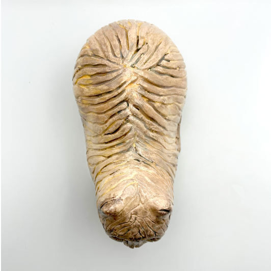 Subtle, long-haired Cat Loaf, inspired by exceptional blue-eyed pussycat rescued from the street. This unique ceramic vessel was ordered for home full of vivid cat presence.